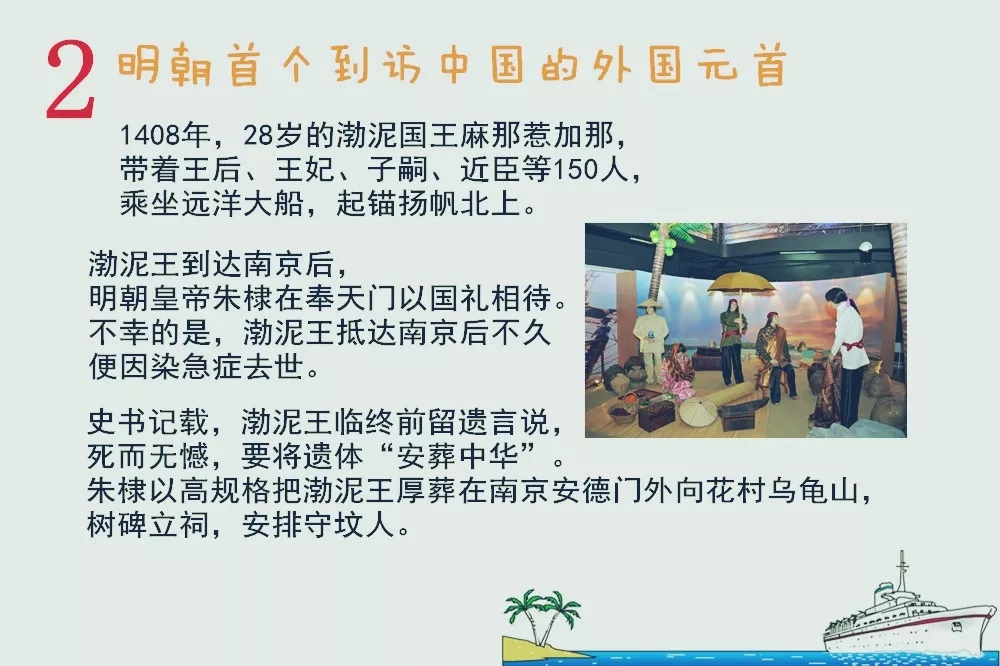 因擔心渤泥政局動蕩,朱棣還特派張謙、周航兩位使臣護送太子遐旺返回渤泥襲王位并助他鎮(zhèn)守一年。1412年農(nóng)歷九月,新國王遐旺帶著母親、叔父等一批人再次訪華。明朝歷史上,外國國王來訪,渤泥王麻那惹加那是第一人。