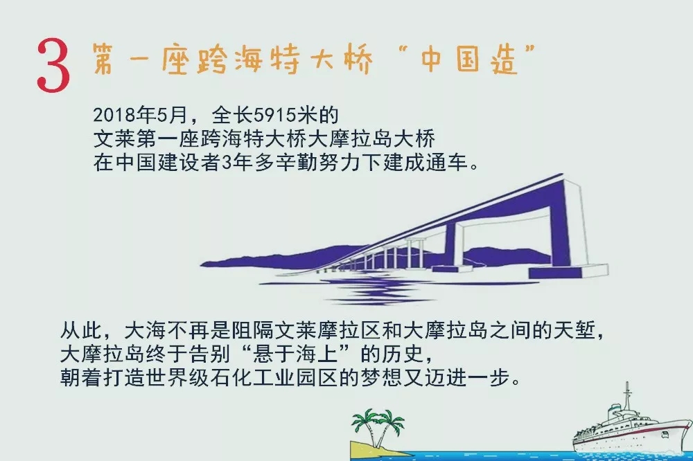 今年5月,全長5915米的文萊第一座跨海特大橋大摩拉島大橋在中國建設(shè)者3年多辛勤努力下建成通車。從此,大海不再是阻隔文萊摩拉區(qū)和大摩拉島之間的天塹,大摩拉島終于告別“懸于海上”的歷史,朝著世界級石化工業(yè)園區(qū)的夢想又邁進一步。