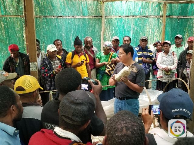 2018年9月4日,在巴布亞新幾內亞東高地省戈羅卡市中國福建省援巴新菌草與旱稻技術合作項目基地,項目組組長林應興向當?shù)孛癖娭v解菌草種植技術。(新華社記者莫華英攝)
