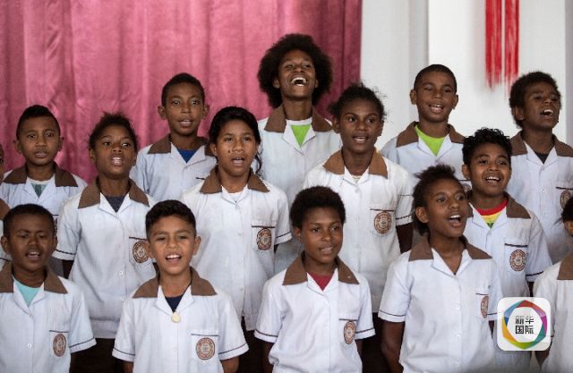 2018年11月13日,巴布亞新幾內亞首都莫爾茲比港。孩子們?yōu)闅g迎出席中國-巴新友誼學?!げ紙D卡學園啟用儀式的習近平主席精心排練歌曲《茉莉花》。(新華社記者費茂華攝)