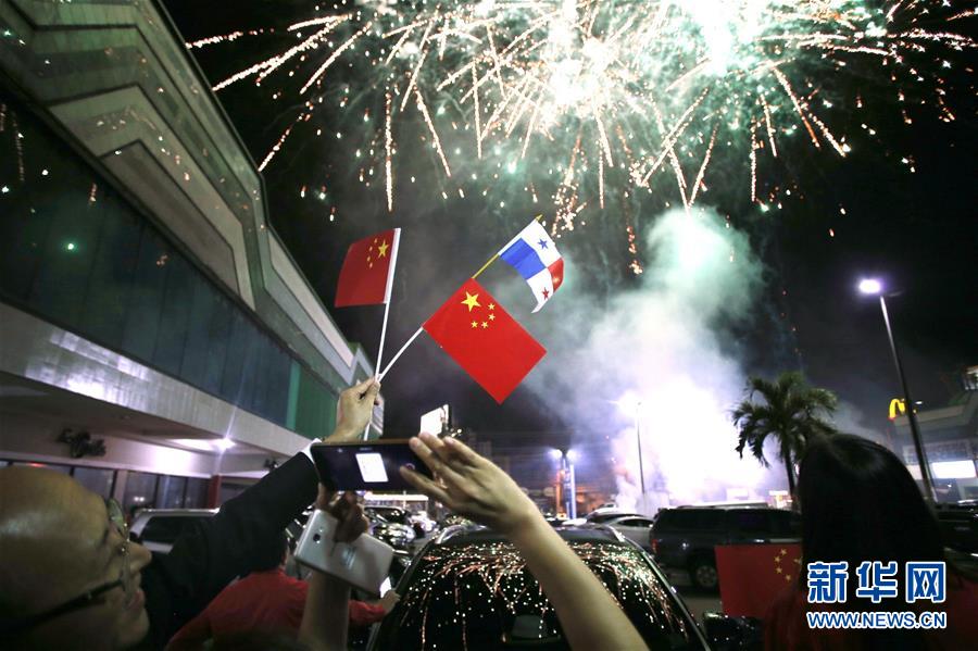 2017年6月12日,在巴拿馬首都巴拿馬城的華人社區(qū),人們在巴拿馬與中國建交的慶?;顒由吓臄z煙花。新華社發(fā)(毛里西奧·巴倫蘇埃拉 攝)