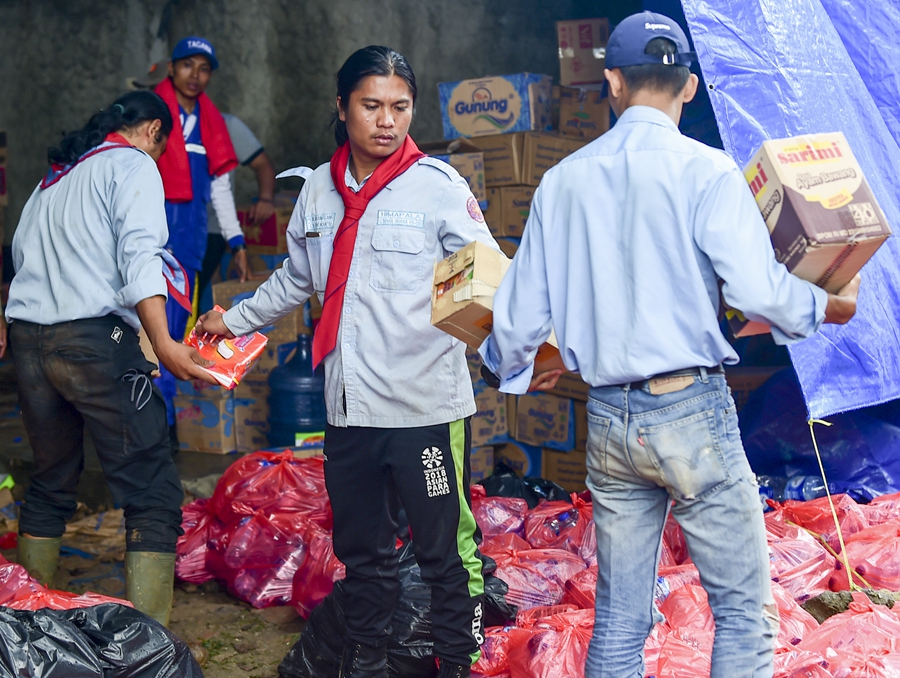 12月25日,在印度尼西亞萬(wàn)丹省板底蘭縣的災(zāi)民安置點(diǎn),參與賑災(zāi)的工作人員為災(zāi)民搬運(yùn)食物。新華社記者杜宇攝