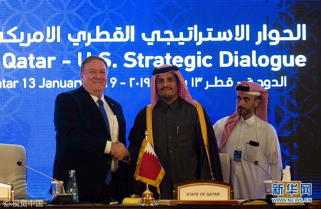 2019年1月13日,卡塔爾多哈,美國(guó)國(guó)務(wù)卿邁克·蓬佩奧訪問卡塔爾。蓬佩奧與卡塔爾副首相兼外交大臣穆罕默德在多哈的喜來登大酒店簽署了諒解備忘錄和意向聲明并舉行聯(lián)合記者會(huì)。蓬佩奧表示,兩國(guó)外交部門領(lǐng)導(dǎo)人當(dāng)天簽署了一份諒解備忘錄,將擴(kuò)建和改造烏代德美國(guó)空軍基地。(圖片來源:視覺中國(guó))