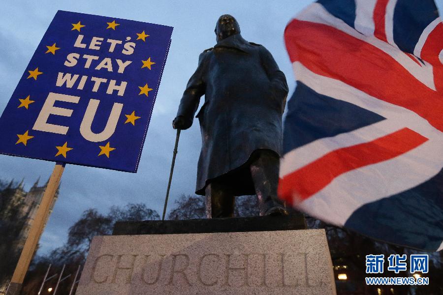 1月15日,在英國倫敦,民眾在議會大廈外的英國前首相丘吉爾雕像前參加集會。 英國議會下院15日投票否決了此前英國政府與歐盟達成的“脫歐”協(xié)議。在經(jīng)過5天辯論后,英國議會下院15日以432票反對、202票支持的投票結果否決了“脫歐”協(xié)議。 新華社發(fā)(蒂姆·愛爾蘭攝)