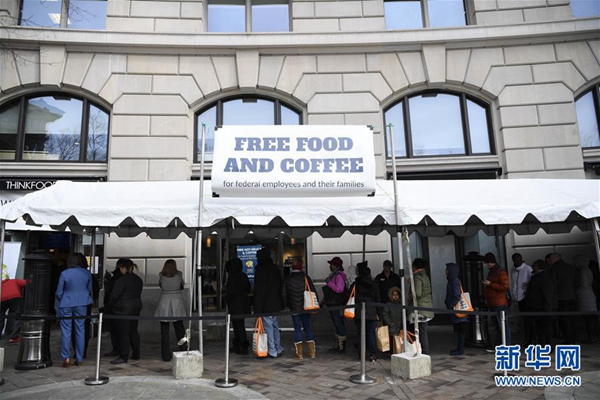1月23日,在美國首都華盛頓,一些聯(lián)邦政府雇員在一家公益組織的“應急食堂”外排隊領取免費餐。 新華社記者 劉杰 攝