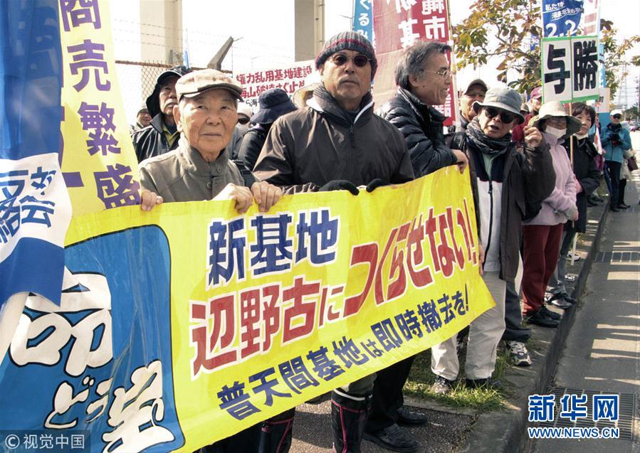 當(dāng)?shù)貢r(shí)間2019年1月26日,日本沖繩縣名護(hù),民眾在美國(guó)海軍陸戰(zhàn)隊(duì)施瓦布軍營(yíng)門(mén)前舉行集會(huì),呼吁在2月24日的地方公投中投票反對(duì)美國(guó)海軍陸戰(zhàn)隊(duì)普天間空軍基地的搬遷計(jì)劃。(圖片來(lái)源:視覺(jué)中國(guó))