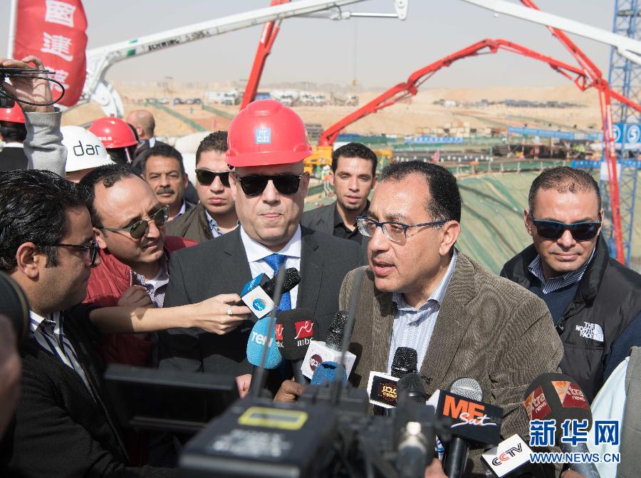 2月25日,在埃及開羅以東約50公里處的新首都中央商務(wù)區(qū),埃及總理穆斯塔法·馬德布利(右二)接受媒體采訪。 埃及總理穆斯塔法·馬德布利25日上午視察了由中國建筑股份有限公司承建的埃及新首都中央商務(wù)區(qū),并見證了標(biāo)志塔主樓1.85萬立方米超大型混凝土基礎(chǔ)底板開盤澆筑。埃及新行政首都中央商務(wù)區(qū)位于首都開羅以東約50公里處,總占地面積約50.5萬平方米,包含20個(gè)高層建筑單體及配套市政工程。 新華社記者鄔惠我攝