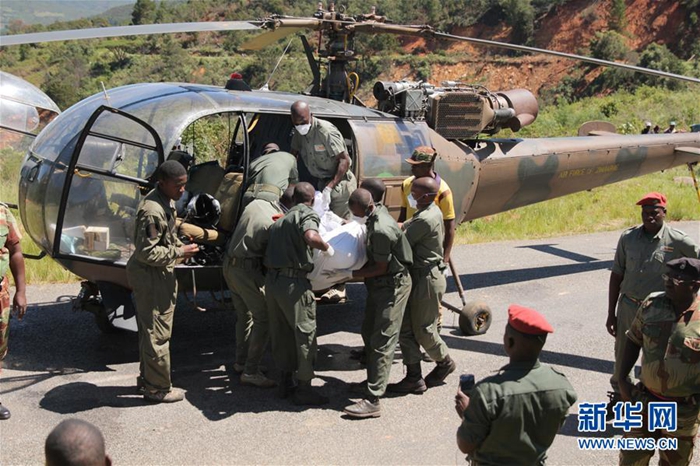 3月21日,在津巴布韋馬尼卡蘭省奇馬尼馬尼,一架軍方直升機(jī)轉(zhuǎn)運(yùn)遇難者遺體。新華社發(fā)(肖恩·朱薩 攝)