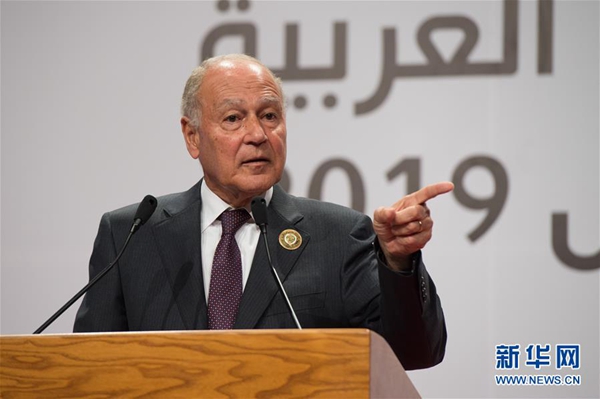 3月31日,在突尼斯首都突尼斯市,阿拉伯國(guó)家聯(lián)盟秘書(shū)長(zhǎng)蓋特在記者招待會(huì)上講話(huà)。新華社記者 孟濤 攝