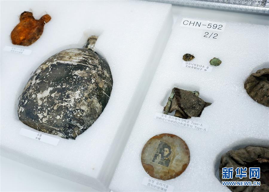 這是在遺骸裝殮儀式現(xiàn)場(chǎng)拍攝的部分志愿軍烈士遺物(4月1日攝)。新華社記者 王婧嬙 攝