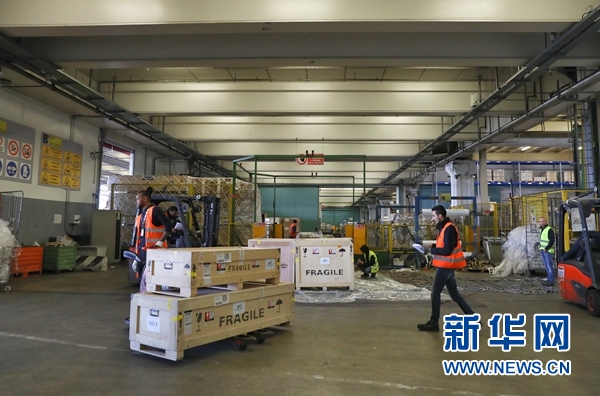 4月9日,在意大利米蘭馬爾彭薩機(jī)場,工作人員將中國流失文物藝術(shù)品運(yùn)送上飛機(jī)。 新華社記者 程婷婷 攝