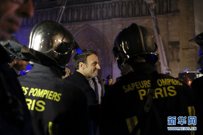 4月15日,在法國巴黎,法國總統(tǒng)馬克龍(中)在火災現(xiàn)場視察。新華社發(fā)(亞歷山大·卡曼 攝)