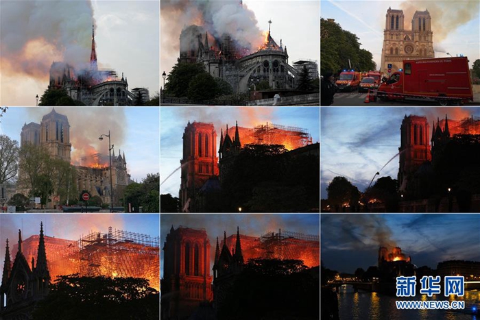 這張拼版照片顯示的是4月15日,在法國(guó)巴黎,巴黎圣母院燃起大火。當(dāng)?shù)貢r(shí)間15日傍晚,位于巴黎市中心、有著800多年歷史的巴黎圣母院發(fā)生大火,熊熊烈火之中,巴黎圣母院塔尖轟然倒塌,整座建筑損毀嚴(yán)重。新華社發(fā)