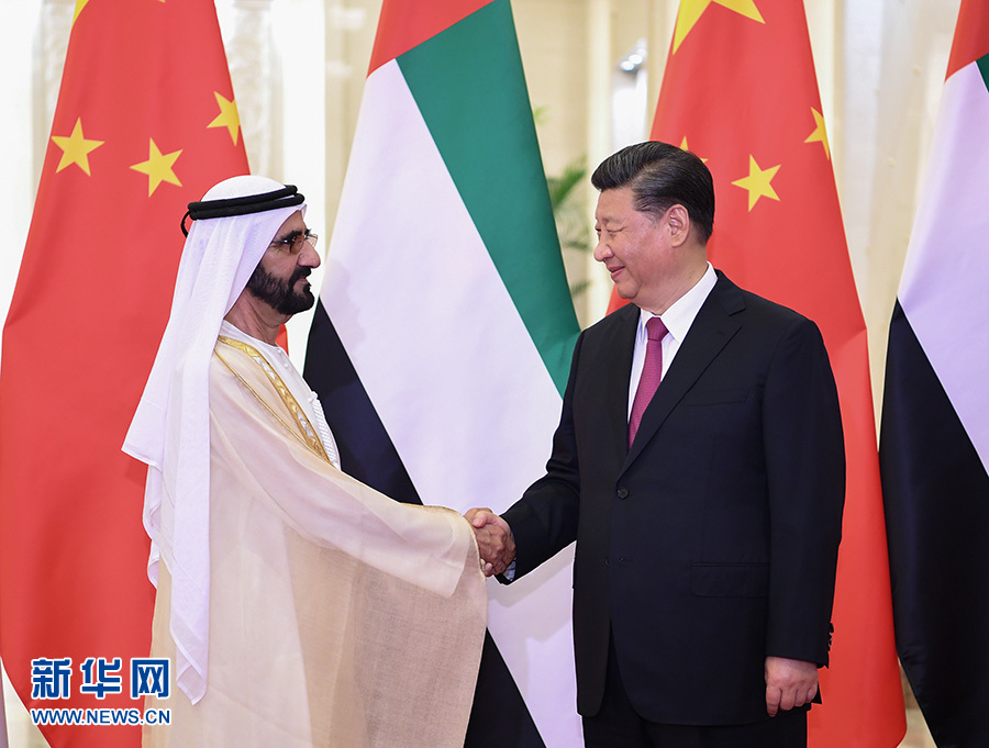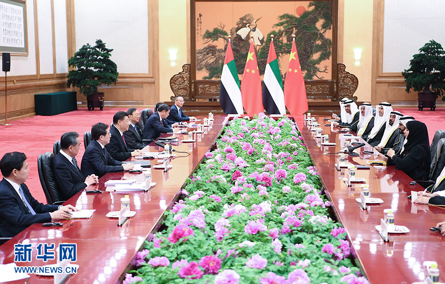 習(xí)近平指出,去年7月我訪問阿聯(lián)酋期間,兩國宣布建立全面戰(zhàn)略伙伴關(guān)系,揭開中阿關(guān)系發(fā)展新篇章。中方視阿聯(lián)酋為共建“一帶一路”的重要合作伙伴。雙方要穩(wěn)步推進(jìn)以能源合作為主軸、以投資和基礎(chǔ)設(shè)施建設(shè)為兩翼、以高新技術(shù)為增長(zhǎng)點(diǎn)的務(wù)實(shí)合作。下階段要對(duì)接創(chuàng)新發(fā)展戰(zhàn)略,打造兩國合作新增長(zhǎng)點(diǎn)。要深化打擊恐怖主義和極端勢(shì)力等安全領(lǐng)域合作,共同維護(hù)兩國和地區(qū)安全穩(wěn)定。副總統(tǒng)先生提出的“擁抱中國”計(jì)劃深受阿聯(lián)酋民眾歡迎,要不懈推動(dòng)兩國人文交流。中方支持阿方明年舉辦中東地區(qū)首屆世博會(huì)。
