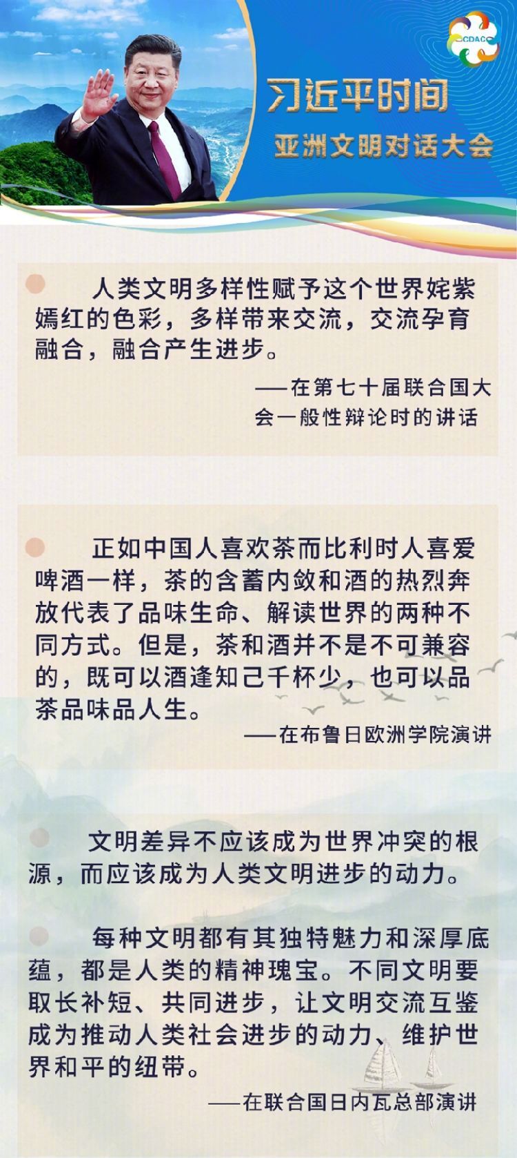“在漫長歷史長河中,如亞洲的黃河和長江流域、印度河和恒河流域、幼發(fā)拉底河和底格里斯河流域以及東南亞等地區(qū)孕育了眾多古老文明,彼此交相輝映、相得益彰,為人類文明進(jìn)步作出了重要貢獻(xiàn)。今天的亞洲,多樣性的特點(diǎn)仍十分突出,不同文明、不同民族、不同宗教匯聚交融,共同組成多彩多姿的亞洲大家庭?!?/p>