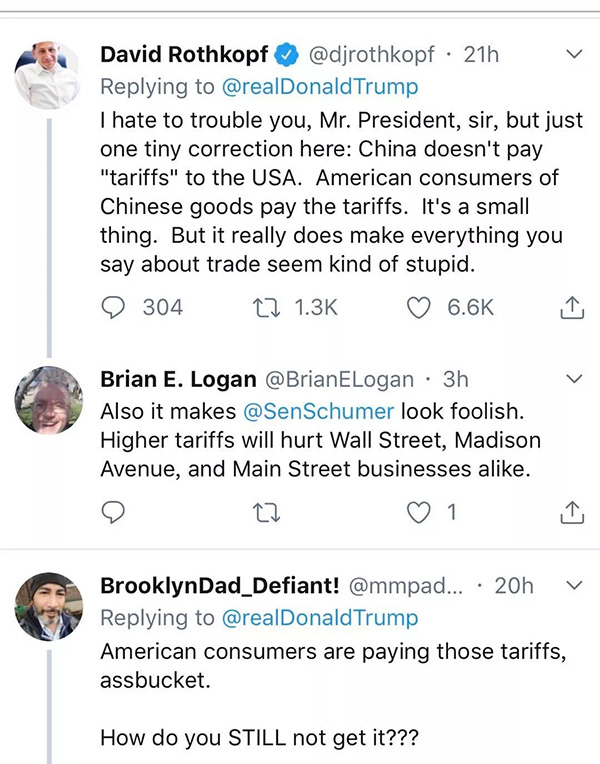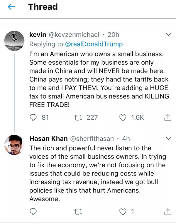 “我是一個(gè)擁有一家小企業(yè)的美國(guó)人。對(duì)我的生意來(lái)說(shuō),有些關(guān)鍵商品必須由中國(guó)制造而且永遠(yuǎn)也不可能在美國(guó)生產(chǎn)出來(lái)。中國(guó)什么也沒(méi)付,是我付出了那些關(guān)稅!你給美國(guó)的企業(yè)們加上了巨大的稅賦!你正在扼殺自由貿(mào)易!”
