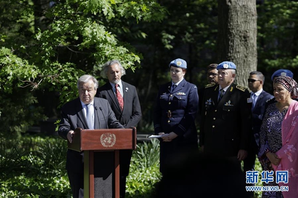 5月24日,在位于紐約的聯(lián)合國(guó)總部,聯(lián)合國(guó)秘書長(zhǎng)古特雷斯(左一)在儀式上致辭。新華社記者 李木子 攝