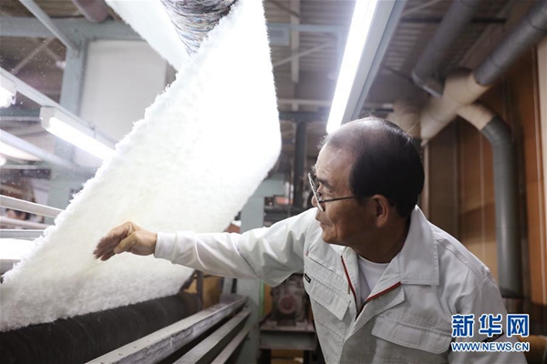 這是5月17日在日本和歌山縣,岡田織物現(xiàn)任社長岡田次弘挑選人造毛皮產(chǎn)品。新華社記者 杜瀟逸 攝