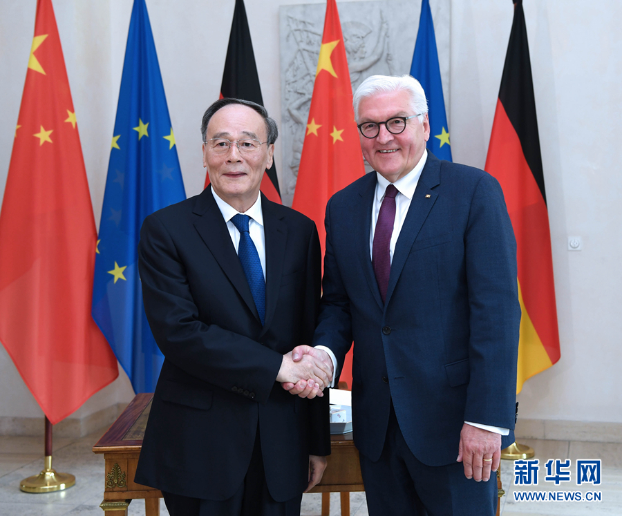 會見施泰因邁爾時,王岐山表示,中德作為世界主要經濟體和具有重要影響的大國,兩國關系超越雙邊范疇,具有全球性意義。近年來,兩國高層交往密切,各領域合作不斷深化。我愿通過此訪進一步推動中德全方位戰(zhàn)略伙伴關系取得新發(fā)展。當前兩國關系面臨新形勢,雙方應通過深化合作為世界樹立合作共贏的典范,通過引領中歐合作為世界注入更多穩(wěn)定因素,通過推進全球治理增強維護多邊主義的力量。