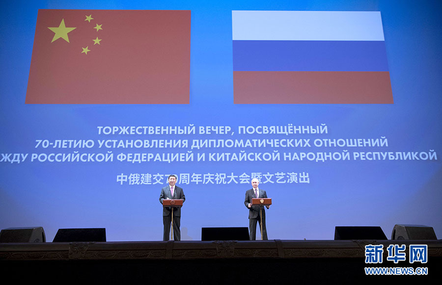 6月5日,國家主席習近平和俄羅斯總統(tǒng)普京在莫斯科大劇院共同出席中俄建交70周年紀念活動。 新華社記者 李學仁 攝