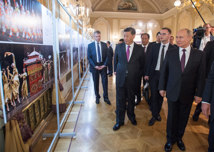 6月5日,國家主席習近平和俄羅斯總統(tǒng)普京在莫斯科大劇院共同出席中俄建交70周年紀念活動。這是兩國元首共同參觀中俄建交70周年圖片展。新華社記者李學仁攝