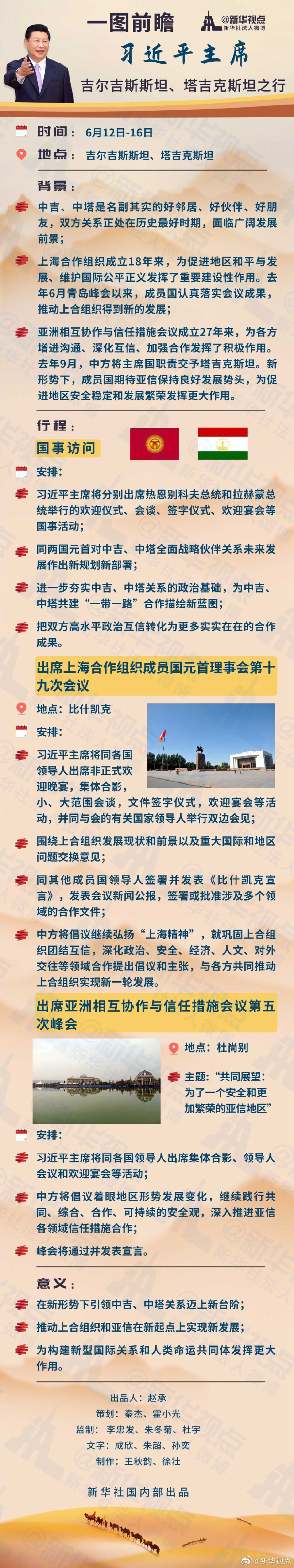 習(xí)近平主席將于6月12日至16日對吉爾吉斯斯坦、塔吉克斯坦進(jìn)行國事訪問并出席在比什凱克舉行的上海合作組織成員國元首理事會第十九次會議和在杜尚別舉行的亞洲相互協(xié)作與信任措施會議第五次峰會。這次出訪有啥看點(diǎn)?戳圖秒懂??