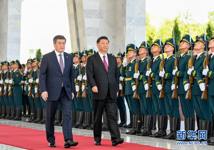 6月13日,國(guó)家主席習(xí)近平在比什凱克同吉爾吉斯斯坦總統(tǒng)熱恩別科夫會(huì)談。會(huì)談前,熱恩別科夫在阿拉爾恰國(guó)賓館會(huì)議中心前廣場(chǎng)為習(xí)近平舉行隆重歡迎儀式。這是兩國(guó)元首檢閱儀仗隊(duì)。 新華社記者 高潔 攝