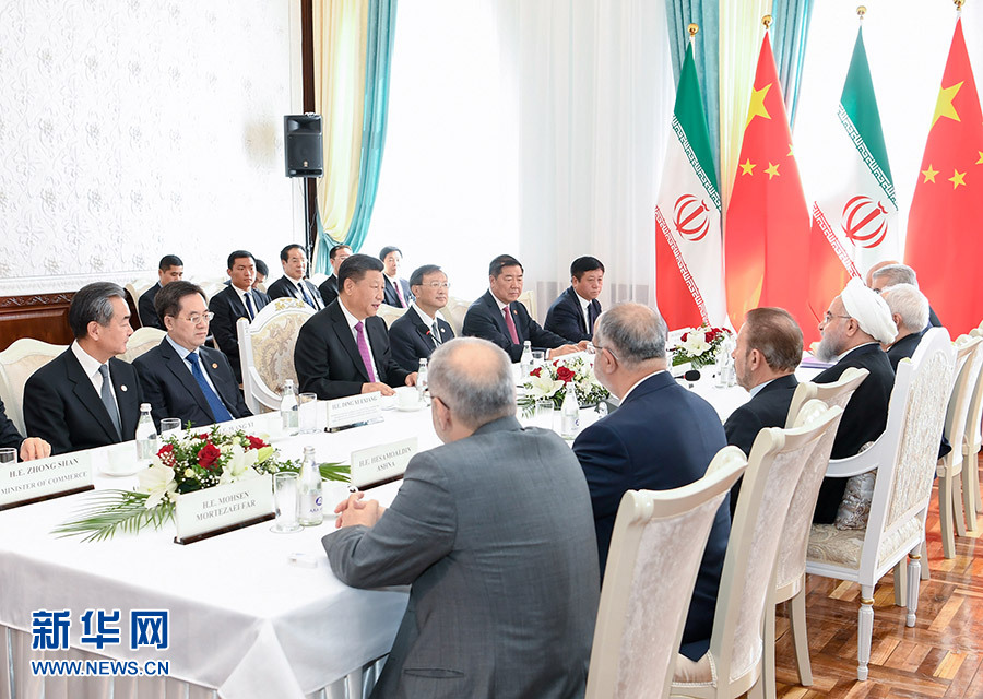 6月14日,國家主席習(xí)近平在比什凱克會見伊朗總統(tǒng)魯哈尼。 新華社記者 殷博古 攝