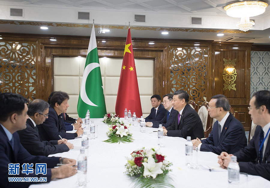 6月14日,國家主席習(xí)近平在比什凱克會(huì)見巴基斯坦總理伊姆蘭·汗。 新華社記者 李學(xué)仁 攝
