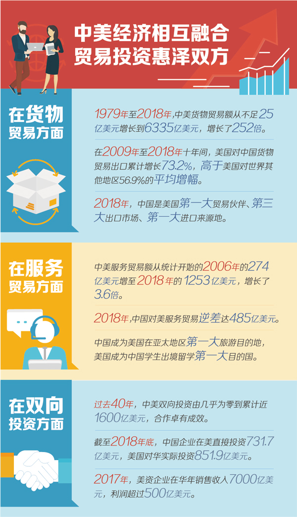 在國際經(jīng)濟(jì)合作中,正常的貿(mào)易關(guān)系是建立在等價(jià)交換基礎(chǔ)上的互惠互利關(guān)系,而不是你多我少、你輸我贏的“零和博弈”。國際貿(mào)易有利于推動(dòng)資源在世界范圍內(nèi)優(yōu)化配置,促進(jìn)各國經(jīng)濟(jì)共同發(fā)展,推動(dòng)人類社會(huì)共同進(jìn)步,國際貿(mào)易的歷史早已證明這樣的實(shí)踐是有效的,實(shí)踐經(jīng)驗(yàn)也早已成為國際經(jīng)濟(jì)學(xué)的基本原理,中美經(jīng)貿(mào)合作的事實(shí)也作了同樣的驗(yàn)證。中美建交以來,在雙邊貿(mào)易方面,1979年至2018年,雙邊貨物貿(mào)易額從不足25億美元增長到6335億美元,增長了252倍;在雙向投資領(lǐng)域,過去40年,中美雙向投資由幾乎為零到累計(jì)近1600億美元,中美互為對(duì)方重要投資伙伴,投資的雙向性和互惠性進(jìn)一步顯現(xiàn)。中美經(jīng)貿(mào)關(guān)系發(fā)展的歷程證明,中美通過優(yōu)勢(shì)互補(bǔ)、互通有無,有力促進(jìn)了各自經(jīng)濟(jì)發(fā)展和產(chǎn)業(yè)結(jié)構(gòu)優(yōu)化升級(jí),雙方經(jīng)貿(mào)往來是惠澤彼此的關(guān)系,而非中國讓美國“吃虧”的過程。