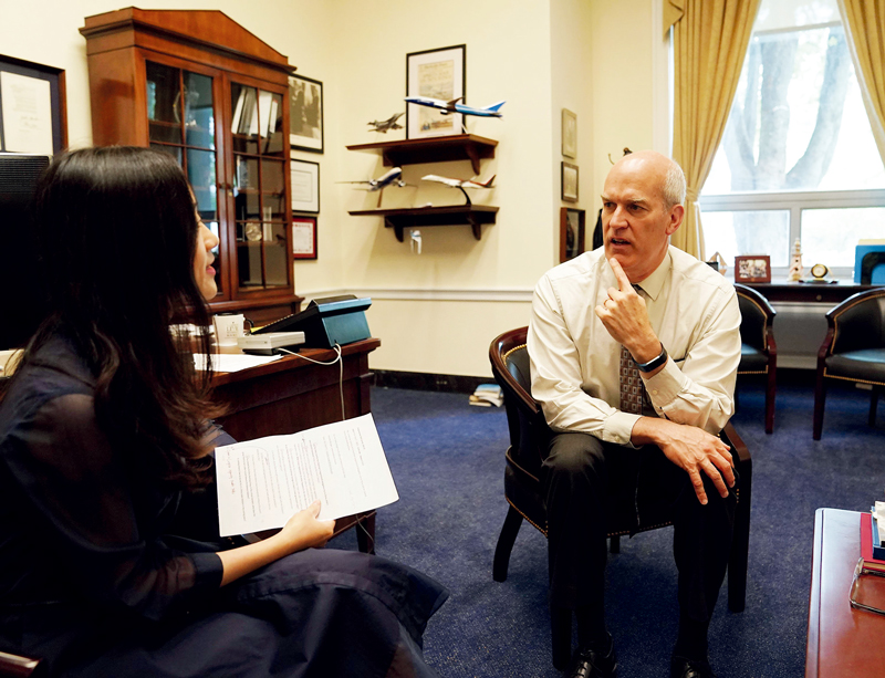 越來越多美國有識(shí)之士認(rèn)識(shí)到,美國政府加征關(guān)稅會(huì)損害美國民眾利益。圖為2019年5月9日,美國國會(huì)眾議院美中工作小組共同主席、華盛頓州民主黨聯(lián)邦眾議員里克·拉森(右)在華盛頓接受采訪時(shí)表示,美國政府對(duì)華產(chǎn)品加征關(guān)稅的做法損害美國工人與消費(fèi)者利益,不利于美國經(jīng)濟(jì),也無助于解決兩國經(jīng)貿(mào)問題。 新華社記者 劉杰/攝