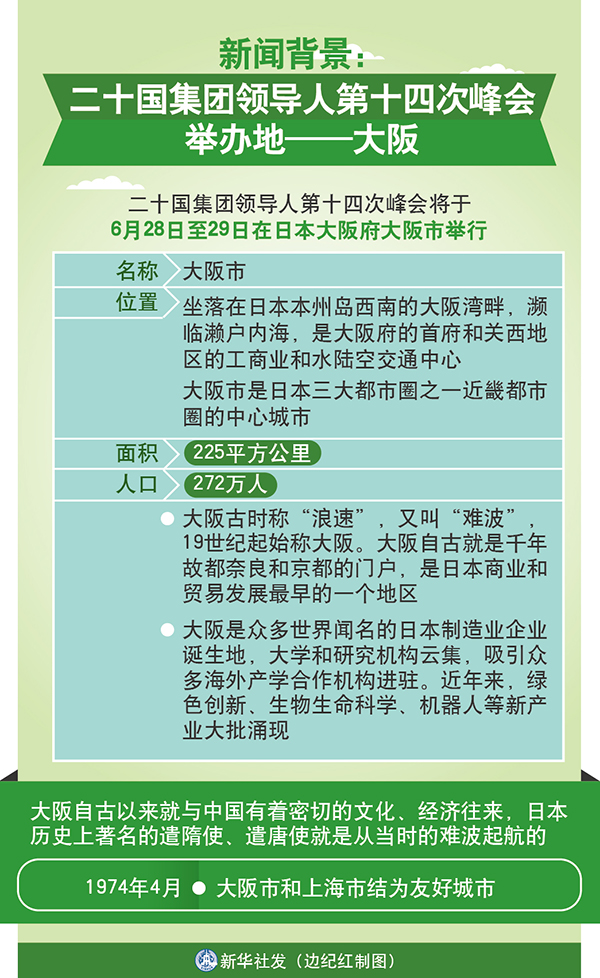 新華社日本大阪6月26日電 新聞背景:二十國集團領導人第十四次峰會舉辦地——大阪