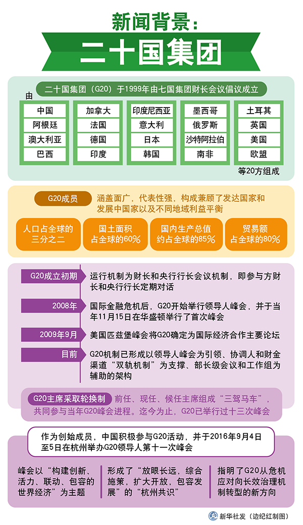 G20于1999年由七國集團財長會議倡議成立,由中國、阿根廷、澳大利亞、巴西、加拿大、法國、德國、印度、印度尼西亞、意大利、日本、韓國、墨西哥、俄羅斯、沙特阿拉伯、南非、土耳其、英國、美國以及歐盟等20方組成。