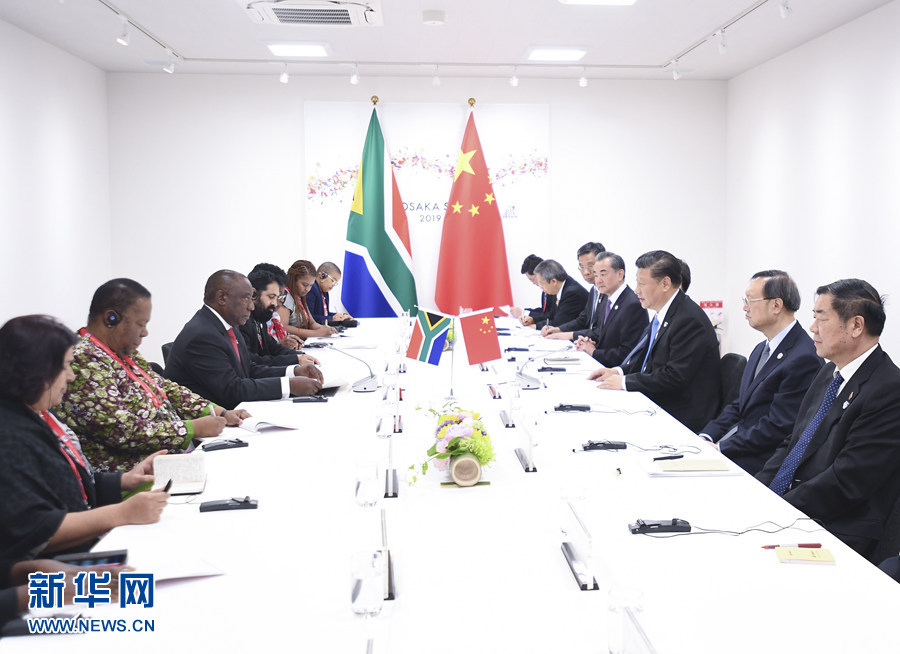 ?6月28日,國家主席習(xí)近平在大阪會見南非總統(tǒng)拉馬福薩。 新華社記者 燕雁 攝