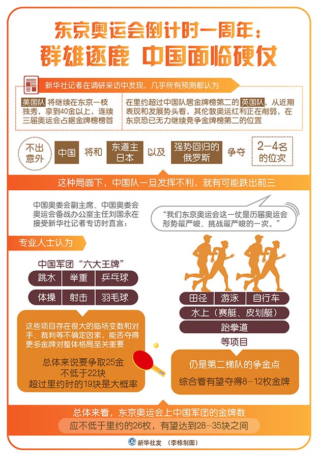 行百里者半九十。在距離東京奧運會僅有一年時間之際,中國軍團的備戰(zhàn)需要更有針對性,強化自身能力建設,進一步加強醫(yī)療、科技、信息等服務保障和制定科學的激勵獎勵機制,也需要各界給予更多支持。不少受訪者表示,目前體育部門在備戰(zhàn)中有獨木難支之感,急需更多制度保障,聯(lián)合其他部門的力量,理順不同部門之間的關系,共同為備戰(zhàn)東京奧運會大局服務。
