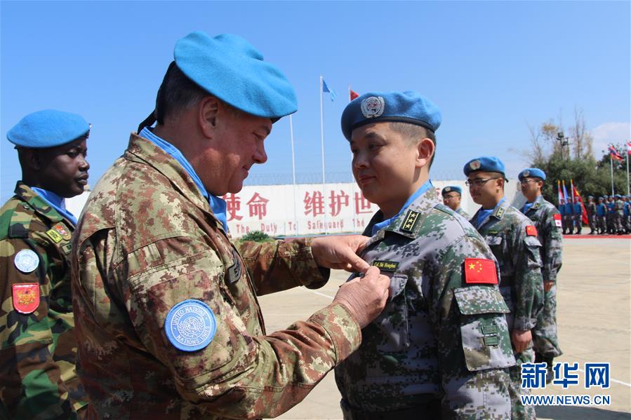 4月3日,在位于黎巴嫩南部辛尼亞村的中國維和部隊營區(qū)舉行的授勛儀式上,聯(lián)黎部隊司令德爾科爾(前左)為官兵代表佩戴勛章。新華社發(fā)