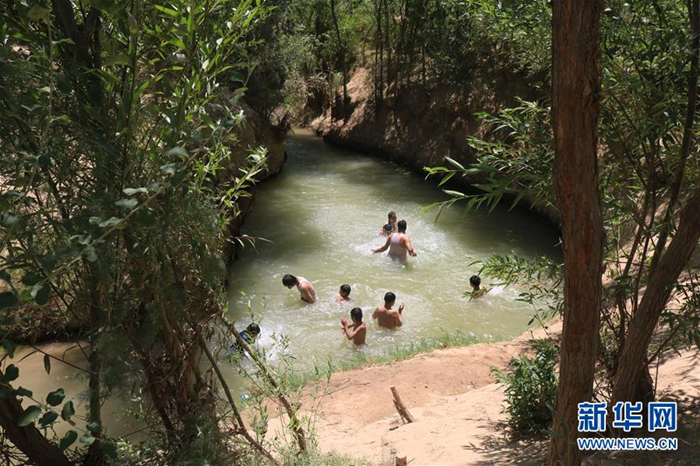 7月19日,在阿富汗北部朱茲詹省希比爾甘,當?shù)貎和谒杏斡炯{涼。新華社發(fā) 穆罕默德·詹·阿里亞 攝