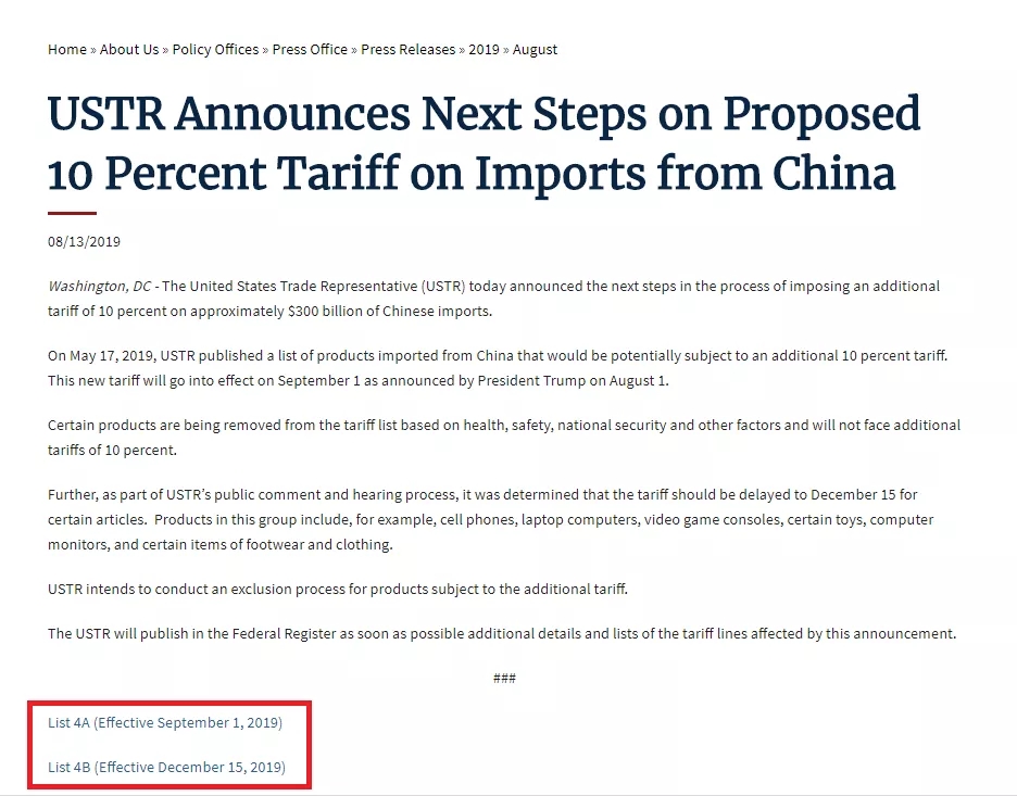 當(dāng)?shù)貢r(shí)間8月13日,美國(guó)貿(mào)易代表辦公室(USTR)官網(wǎng)掛出聲明,公布了接下來對(duì)中國(guó)輸美產(chǎn)品加征關(guān)稅的相關(guān)計(jì)劃。與此前美方聲稱的9月1日生效日期不同的是,部分對(duì)華關(guān)稅的生效將推遲到12月15日。