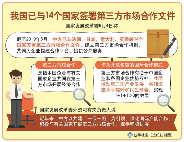 新華社北京9月4日電(記者安蓓)國家發(fā)展改革委4日稱,截至2019年6月,中方已與法國、日本、意大利、英國等14個(gè)國家簽署第三方市場合作文件,建立第三方市場合作機(jī)制,共同為企業(yè)搭建合作平臺、提供公共服務(wù)。