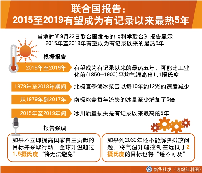 新華社聯(lián)合國9月22日電(記者王建剛)聯(lián)合國22日發(fā)布的一份報告顯示,2015年至2019年有望成為有記錄以來的最熱5年。