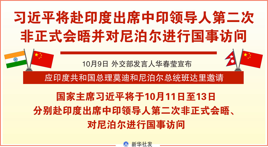 新華社北京10月9日電 外交部發(fā)言人華春瑩9日宣布:應印度共和國總理莫迪和尼泊爾總統(tǒng)班達里邀請,國家主席習近平將于10月11日至13日分別赴印度出席中印領導人第二次非正式會晤、對尼泊爾進行國事訪問。