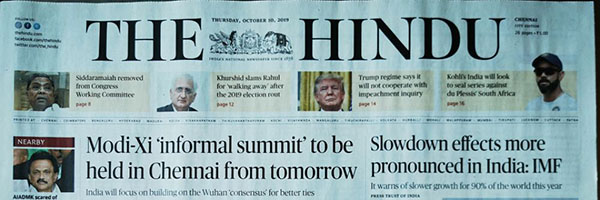 10日清晨6時(shí),當(dāng)天的《印度教徒報(bào)》已送抵讀者手中。頭條為兩國領(lǐng)導(dǎo)人非正式會(huì)晤將于明日起在金奈舉行的消息。