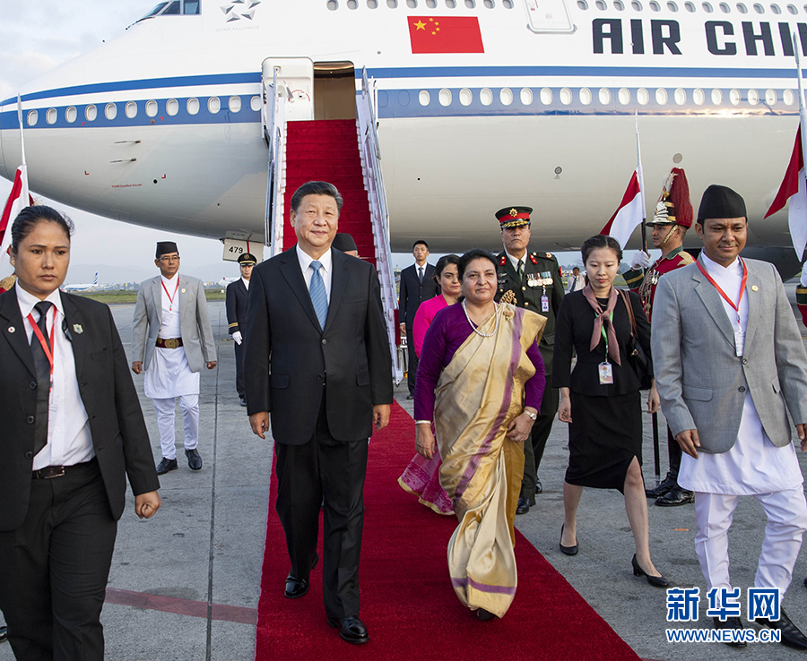 10月12日,國家主席習(xí)近平乘專機(jī)抵達(dá)加德滿都,開始對尼泊爾進(jìn)行國事訪問。習(xí)近平步出艙門,尼泊爾總統(tǒng)班達(dá)里偕女兒烏莎在舷梯旁熱情迎接。 新華社記者 李濤 攝