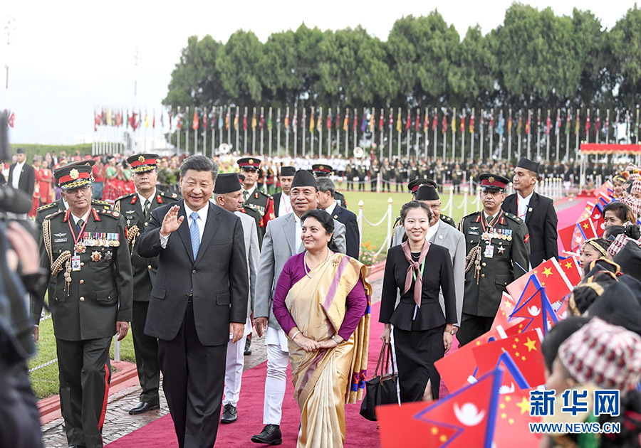 10月12日,國家主席習(xí)近平乘專機(jī)抵達(dá)加德滿都,開始對尼泊爾進(jìn)行國事訪問。尼泊爾總統(tǒng)班達(dá)里在機(jī)場為習(xí)近平舉行具有濃郁尼泊爾民族特色的歡迎儀式。這是習(xí)近平在班達(dá)里陪同下檢閱儀仗隊。 新華社記者 李學(xué)仁 攝