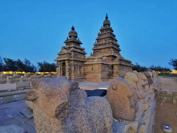 海岸神廟于公元700年至728年間建造,為南印度現存最古老的巖石結構神廟之一。塔型建筑主要用于宗教祭祀。據傳,海岸最初有七座神廟,但因海岸線變化和海水侵蝕,最終只剩下一座,故此地又名“七塔寺”。新華社記者王曄攝