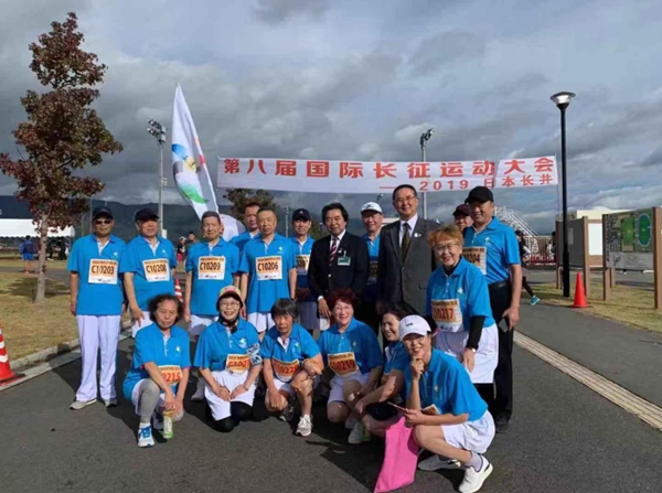 日本長(zhǎng)井市市長(zhǎng)內(nèi)谷重治、副市長(zhǎng)平進(jìn)介、國(guó)際長(zhǎng)征運(yùn)動(dòng)會(huì)創(chuàng)始人杜地以及部分運(yùn)動(dòng)員在比賽現(xiàn)場(chǎng)合影。(圖片由國(guó)際長(zhǎng)征運(yùn)動(dòng)會(huì)委員會(huì)提供)