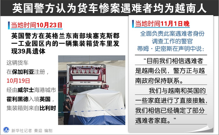 全面負(fù)責(zé)此案遇難者身份調(diào)查工作的警官蒂姆·史密斯在聲明中說:“目前我們相信遇難者是越南公民,警方正與越南政府保持聯(lián)系。我們與越南和英國的一些家庭進(jìn)行了直接接觸,我們相信已經(jīng)確定了部分遇難者家庭。”