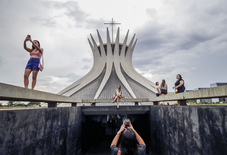 這是2019年11月2日拍攝的游客在巴西利亞大教堂外拍照留念。新華社記者蘭紅光攝