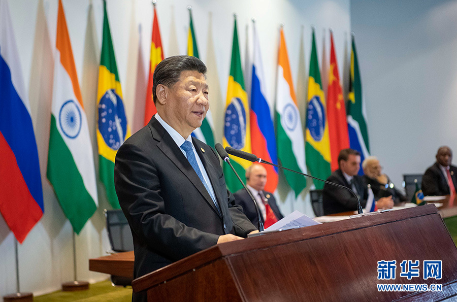 當(dāng)?shù)貢r(shí)間11月14日,金磚國(guó)家領(lǐng)導(dǎo)人同金磚國(guó)家工商理事會(huì)和新開發(fā)銀行對(duì)話會(huì)在巴西利亞舉行。中國(guó)國(guó)家主席習(xí)近平、巴西總統(tǒng)博索納羅、俄羅斯總統(tǒng)普京、印度總理莫迪、南非總統(tǒng)拉馬福薩共同出席。這是習(xí)近平發(fā)表講話。 新華社記者 李學(xué)仁 攝