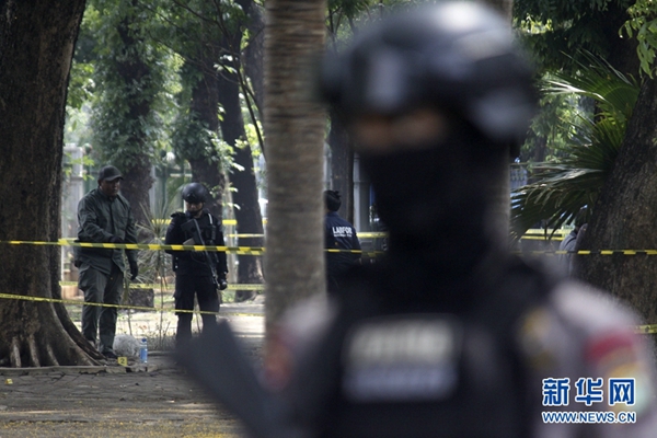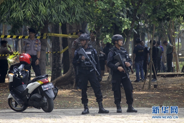 12月3日,在印度尼西亞雅加達,警察在爆炸現(xiàn)場警戒。新華社發(fā)(阿迪蒂亞·伊拉萬 攝)